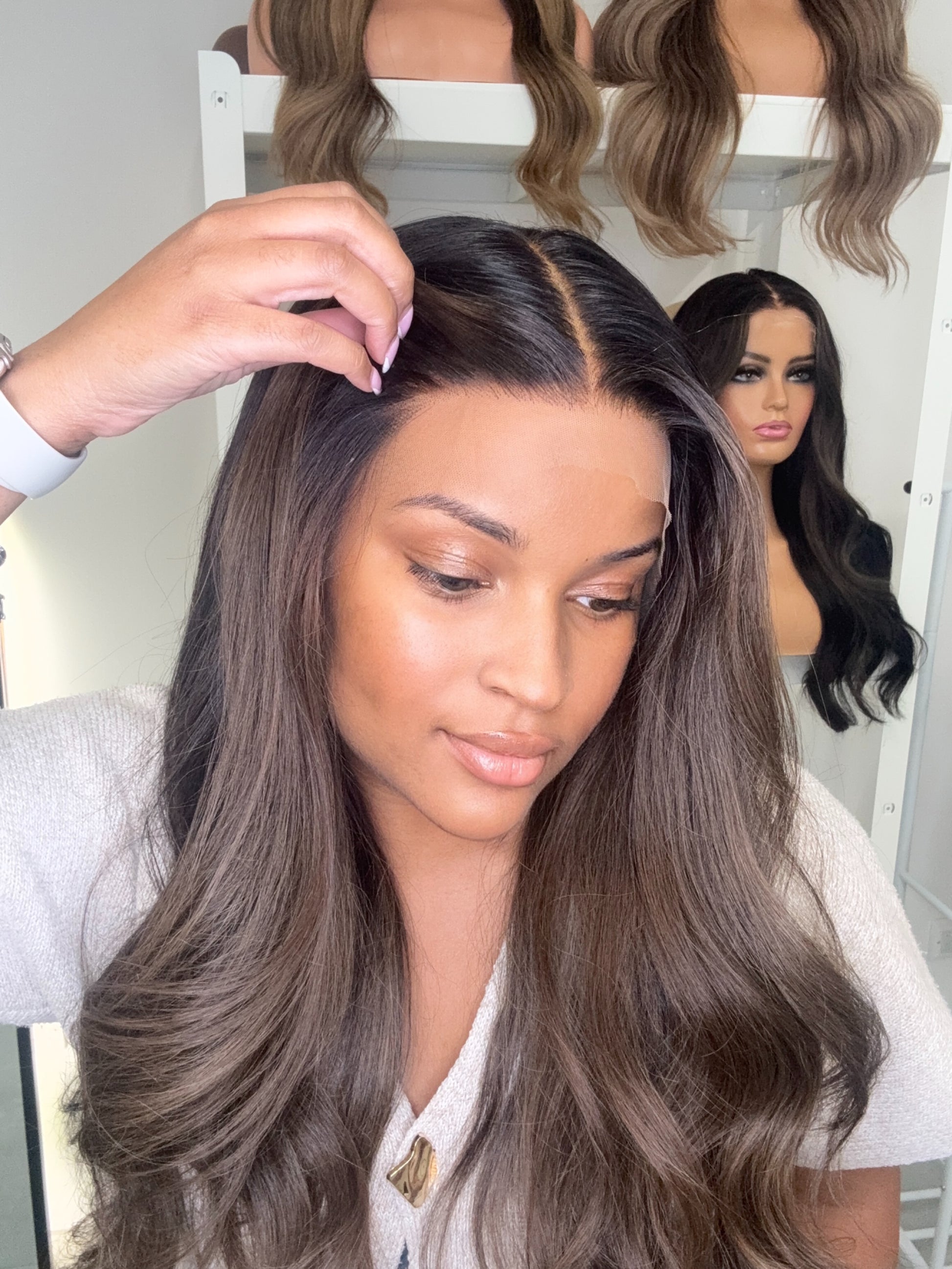 The Cyn Wig features a neutral cool brown balayage that blends seamlessly with natural hair tones. This 13x4 HD lace front delivers an undetectable hairline with superior transparency, while the medium cap size ensures a comfortable, secure fit for extended wear. The balayage technique creates dimensional depth and movement, offering a sophisticated, lived-in aesthetic. Ideal for those seeking a versatile, low-maintenance style that transitions effortlessly from day to evening.