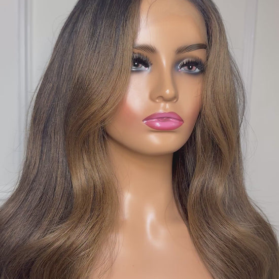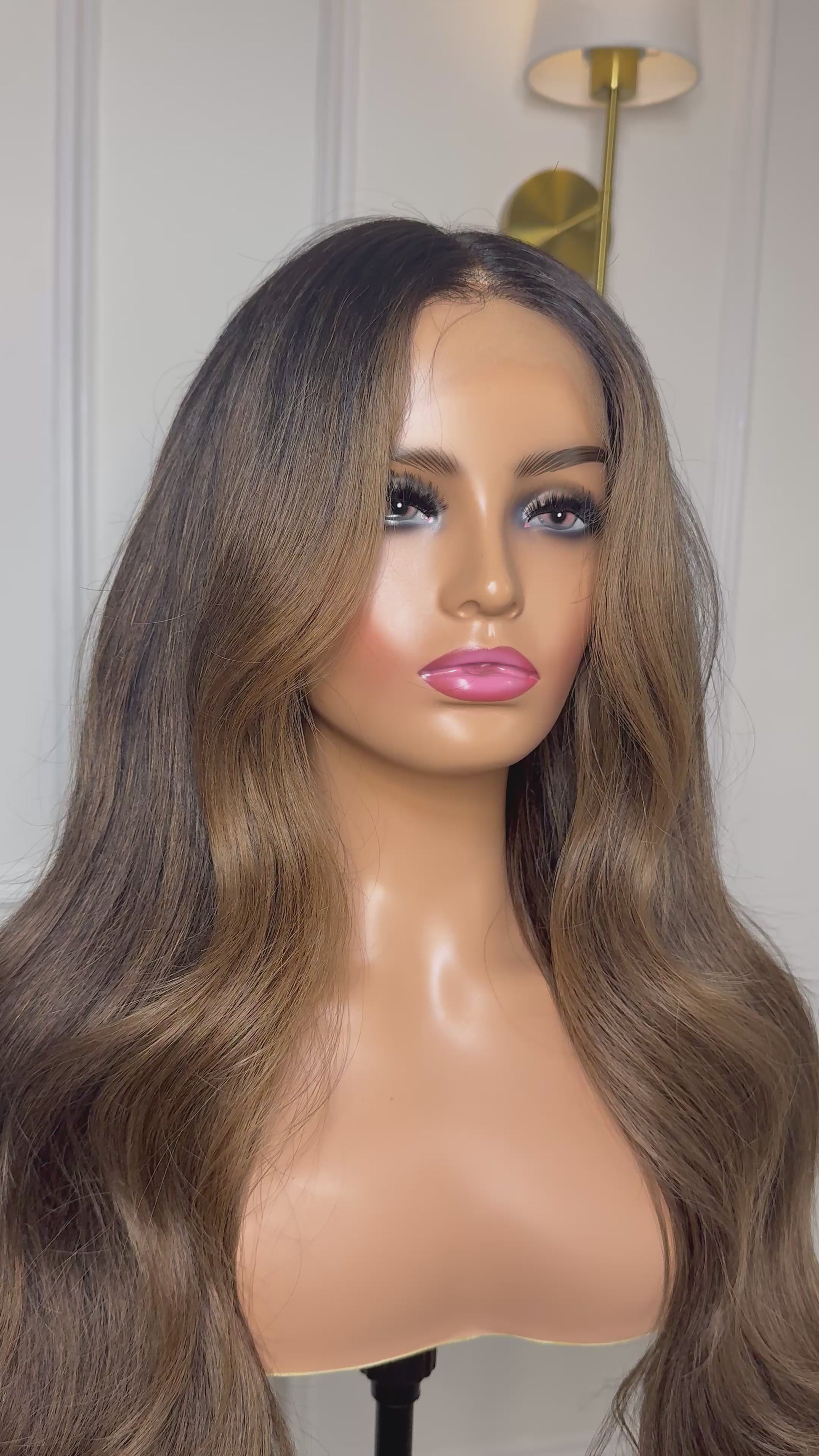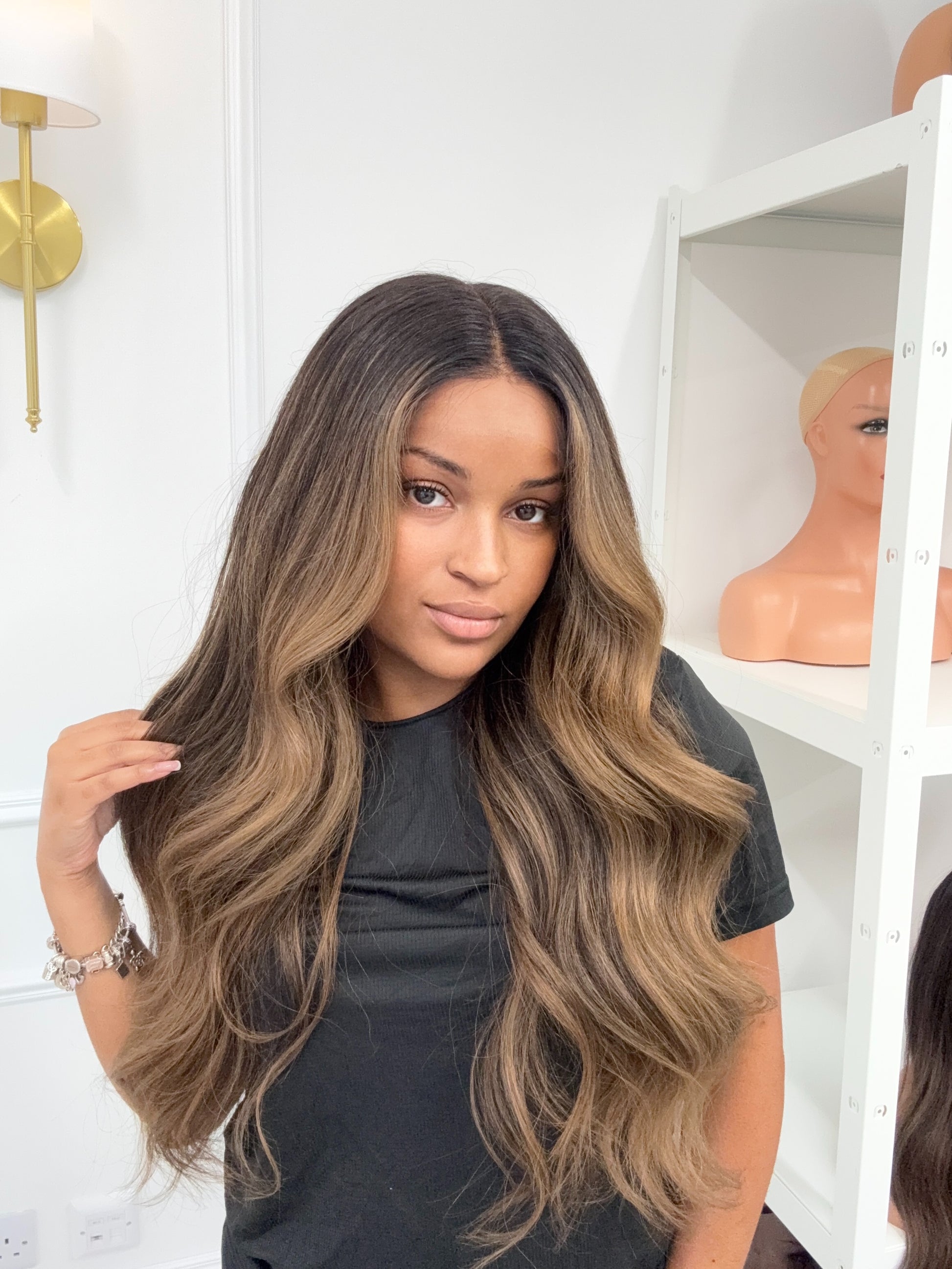 Imogen offers a sophisticated toffee balayage blend with neutral golden beige tones, extending 24 inches for a natural, sun-kissed finish. Designed with a 9x6 HD lace and a small/medium cap size, this wig provides seamless blending and comfortable wear. Perfect for refined elegance that complements the effortless grace of London style.