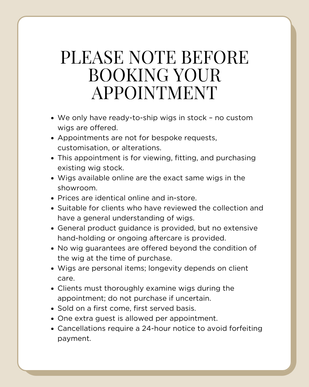 All consultations are strictly for trying on wigs that are currently listed as in stock on our website. If you already love the wig(s) as-is and simply want to confirm your choice in person, this service is perfect for you.